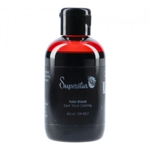 Het Superstar Nepbloed Donker Dik is een mooi en donker kunstbloed. Het is vrij dik en blijft mooi op de aangebrachte plek zonder uit te lopen en kan gebruikt worden voor het maken van bloederige wonden. Het bloed stolt. Door licht en donker bloed te combineren creëer je een mooi resultaat.  Ideaal voor wonden en Halloween.