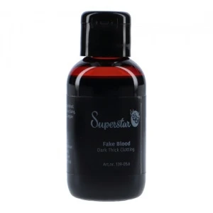 Het Superstar Nepbloed Donker Dik is een mooi en donker kunstbloed. Het is vrij dik en blijft mooi op de aangebrachte plek zonder uit te lopen en kan gebruikt worden voor het maken van bloederige wonden. Het bloed stolt. Door licht en donker bloed te combineren creëer je een mooi resultaat.  Ideaal voor wonden en Halloween.