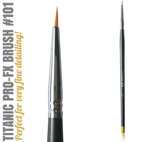 Titanic Pro-FX Liner Brush 101  een penseel speciaal ontworpen voor de Special FX Makeup artiest. De haren van het penseel zijn met een speciaal ontwikkelde lijm vast gezet zodat de lijm die de haren bij elkaar houdt niet oplost en je met een gerust hart deze penselen kunt gebruiken in je Special FX werk. De productie van deze penselen gebeurt etisch verantwoord. De haren zijn synthetisch en veganistisch. Je kunt dit penseel gebruiken voor het aanbrengen en verwijderen van prosthetics en het kleuren ervan. Multifunctioneel dus.