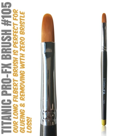 Titanic Pro-FX Long Filbert Brush 105  een penseel speciaal ontworpen voor de Special FX Makeup artiest. De haren van het penseel zijn met een speciaal ontwikkelde lijm vast gezet zodat de lijm die de haren bij elkaar houdt niet oplost en je met een gerust hart deze penselen kunt gebruiken in je Special FX werk. De productie van deze penselen gebeurt etisch verantwoord. De haren zijn synthetisch en veganistisch. Je kunt dit penseel gebruiken voor het aanbrengen en verwijderen van prosthetics en het kleuren ervan. Multifunctioneel dus.