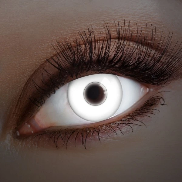 Deze UV-contactlenzen in het wit zijn uitzonderlijk en iets dat zeer weinigen kennen. Stel je de mensen om je heen voor wanneer je een disco of club binnenstapt en je ogen in helder wit oplichten als bij toverslag. Het zwart van je pupil werkt in schril contrast met het wit en draagt ​​nog meer bij aan het effect. Met deze UV-lenzen in wit zijn de eyecatchers op elk feest en iedereen wil weten waar je de lenzen hebt. Met de witte UV-contactlenzen heb je de ultieme aanvulling op de blacklight-make-up. De grappige lenzen schijnen in het zwart licht in een helder wit en zijn de perfecte kostuumaccessoires, waarmee je op Halloween de absolute blikvanger zult zijn.