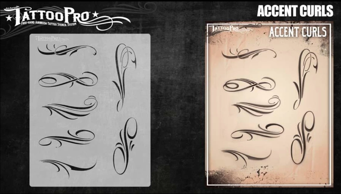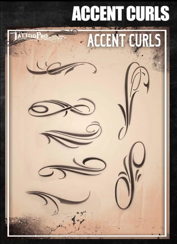 Wiser’s Airbrush TattooPro Stencil – Accent Curls zijn Airbrush sjablonen speciaal ontworpen door Bodypaint en Graffiti artist Wiser Oner. Van de sjablonen kun je zowel de positieve als de negatieve delen gebruiken, als je ze uit het vel drukt. Eindeloos te combineren met de andere TattooPro stensils, zodat er iedere keer weer een originele Airbrush Tattoo ontstaat.