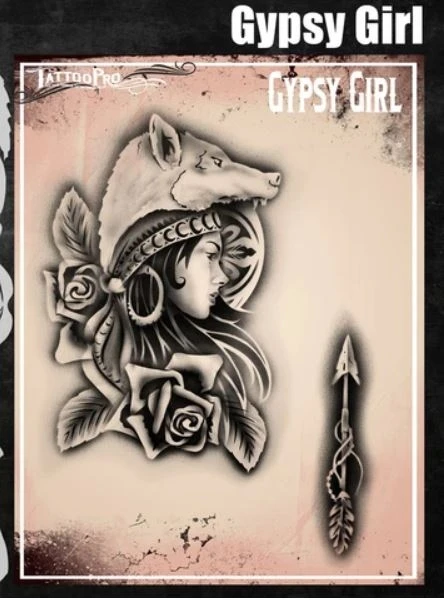 Wiser’s Airbrush TattooPro Stencil – Gypsy Girl zijn Airbrush sjablonen speciaal ontworpen door Bodypaint en Graffiti artist Wiser Oner. Van de sjablonen kun je zowel de positieve als de negatieve delen gebruiken, als je ze uit het vel drukt. Eindeloos te combineren met de andere TattooPro stensils, zodat er iedere keer weer een originele Airbrush Tattoo ontstaat.