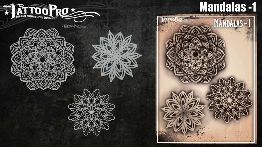 Wiser’s Airbrush TattooPro Stencil – Mandala’s nr. 1zijn Airbrush sjablonen speciaal ontworpen door Bodypaint en Graffiti artist Wiser Oner. Van de sjablonen kun je zowel de positieve als de negatieve delen gebruiken, als je ze uit het vel drukt. Eindeloos te combineren met de andere TattooPro stensils, zodat er iedere keer weer een originele Airbrush Tattoo ontstaat.